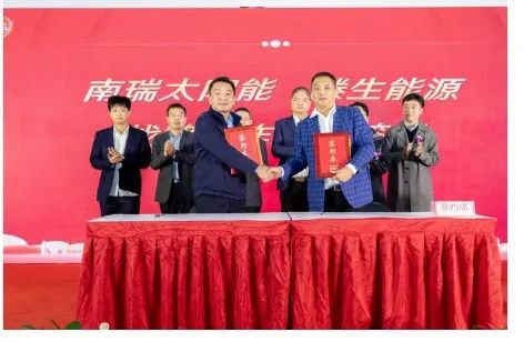 會(huì )上,國網(wǎng)南瑞太陽(yáng)能科技有限公司與滕生能源正式簽署戰略合作協(xié)議書(shū),標志著(zhù)合作雙方將在市場(chǎng)、技術(shù)、生產(chǎn)、供應鏈等方面展開(kāi)全面合作。